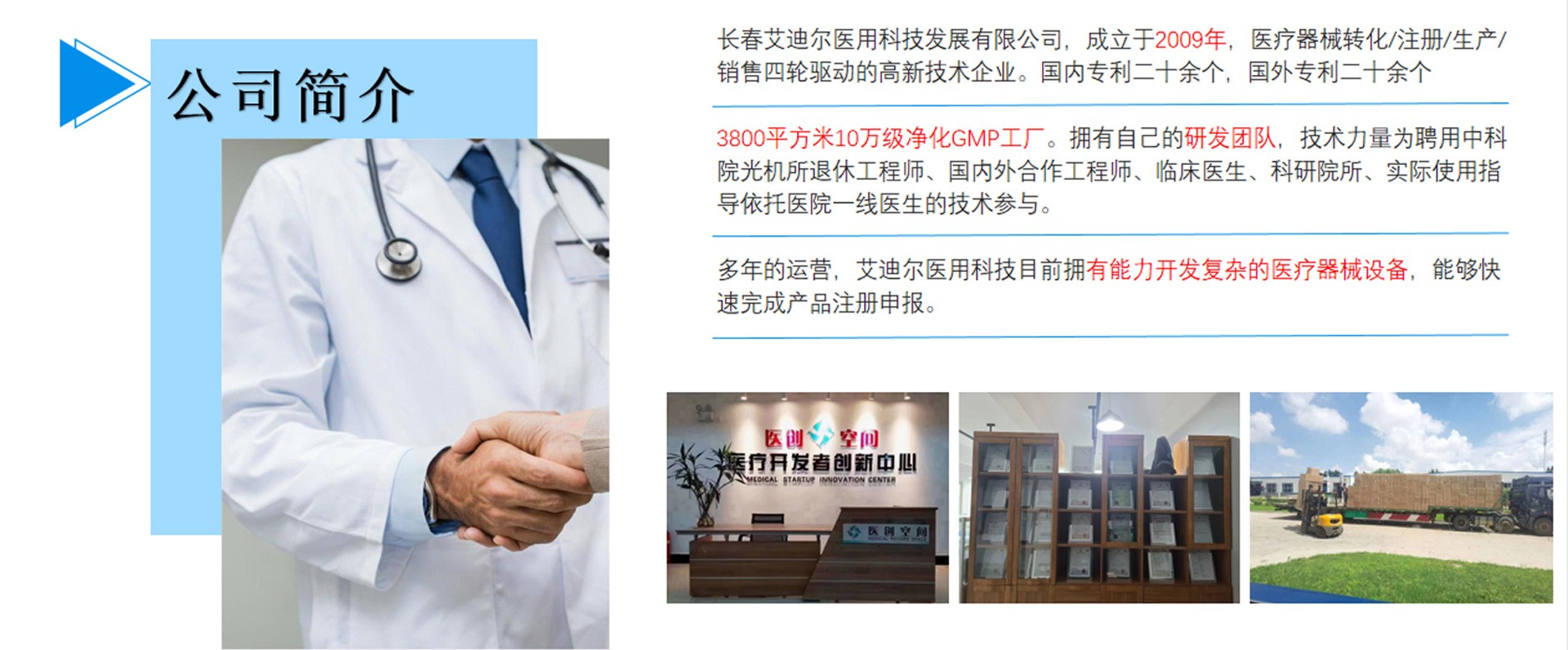 長(zhǎng)春艾迪爾醫(yī)用科技發(fā)展有限公司為集產(chǎn)(自有工廠); 學(xué)(多所院校科研課題合作單位);研(研發(fā)成果轉(zhuǎn)化注冊(cè))三位一體的高新技術(shù)企業(yè)。艾迪爾科技主要經(jīng)營(yíng)范圍為一次性醫(yī)療器械耗材的開(kāi)發(fā),專注于抗菌肽新材料的開(kāi)發(fā)和研制,以“IN-58抗菌肽一類新藥及原料藥注冊(cè)、激光類治療儀”兩個(gè)核心優(yōu)勢(shì)技術(shù)為中心。公司擁有標(biāo)準(zhǔn)GMP車間及健全的質(zhì)量管理體系,擁有多個(gè)已上市和即將上市的產(chǎn)品,包括睡眠、泌尿、口腔、肝膽、消殺、婦科六大系列產(chǎn)品線。公司擁有核心專業(yè)技術(shù)報(bào)批團(tuán)隊(duì),承接國(guó)內(nèi)外醫(yī)療器械專項(xiàng)成果轉(zhuǎn)化,具備自主研發(fā)能力及MAH服務(wù)能力。